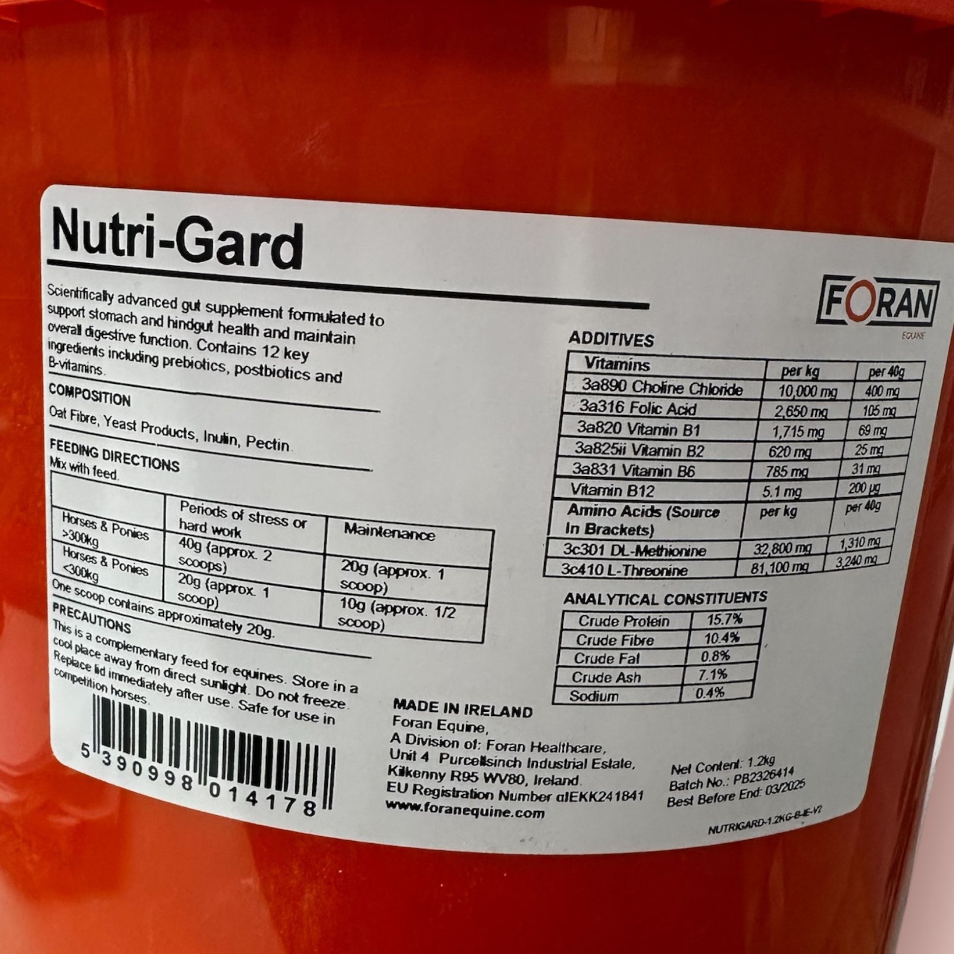 Foran Equine Nutri-Gard (New and Improved Formula) offers gastric health support through an enhanced prebiotic, highly digestible fibres and B-vitamins to promote appetite